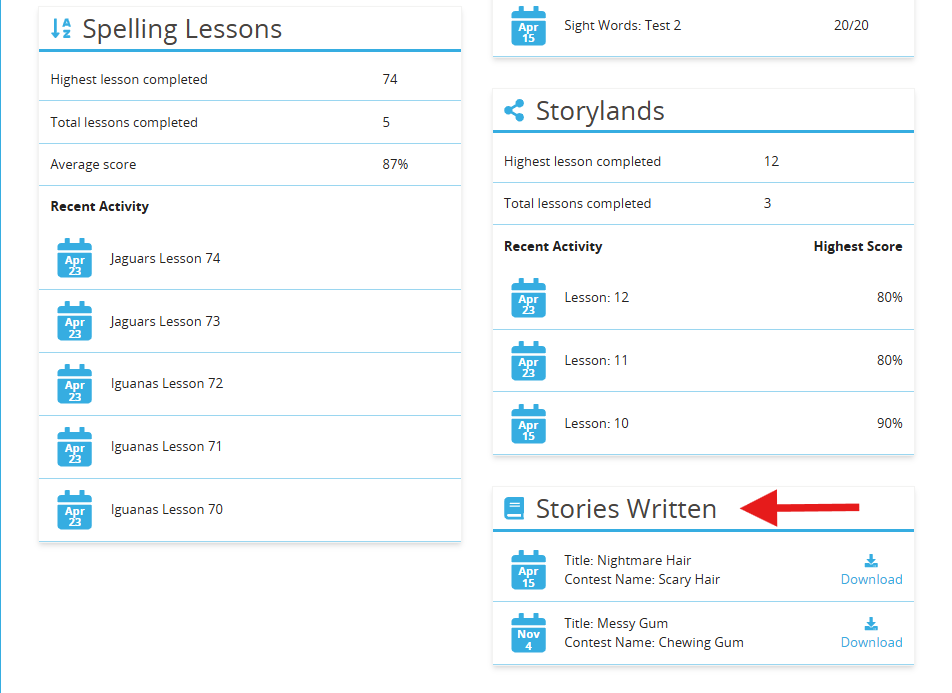 From the family dashboard select the relevant child’s tab, tap 'View full progress report' and scroll down to ‘Stories Written’, then click ‘Download’ next to the story you would like to print.