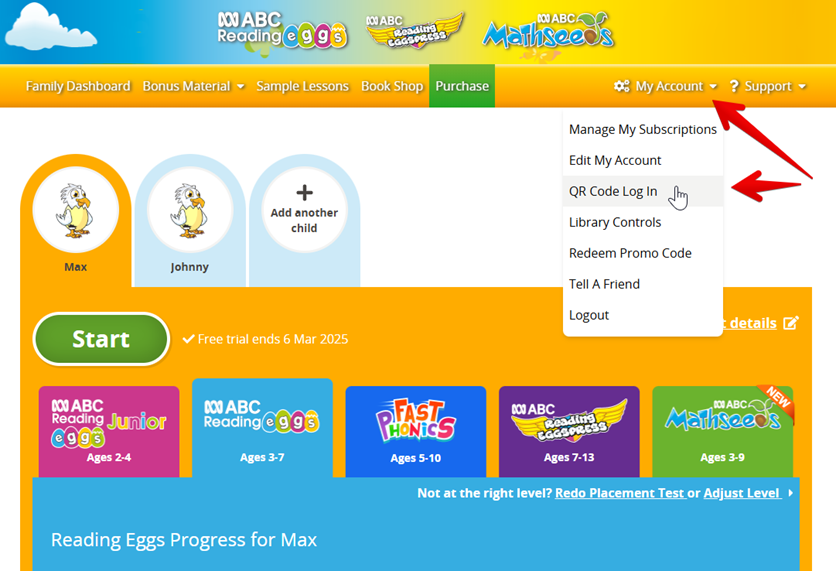 Your child's Reading Eggs Log In QR Code can be accessed from the My Account menu in the Family Dashboard