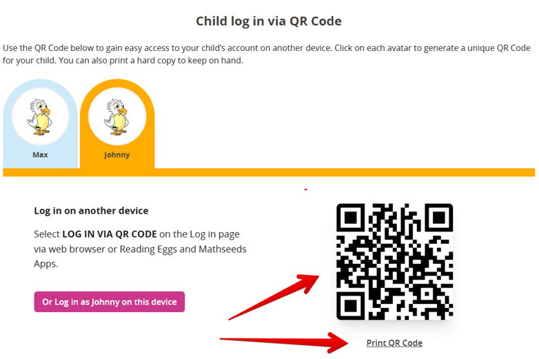 You will then have the option to either log straight in for that child on another device by scanning the QR code or to print a hard copy to keep handy for future use.