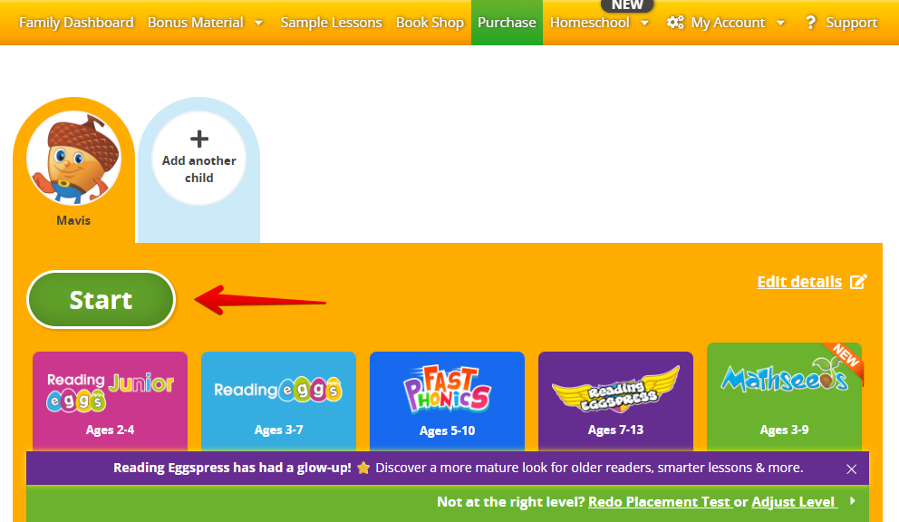 In Reading Eggs, Reading Eggspress and Mathseeds, select the Lessons tab.